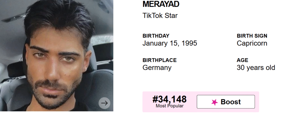 He has earned more than 1.3 million followers to his _merayad Instagram account, where he primarily posts selfies, modeling pictures and workout photos.